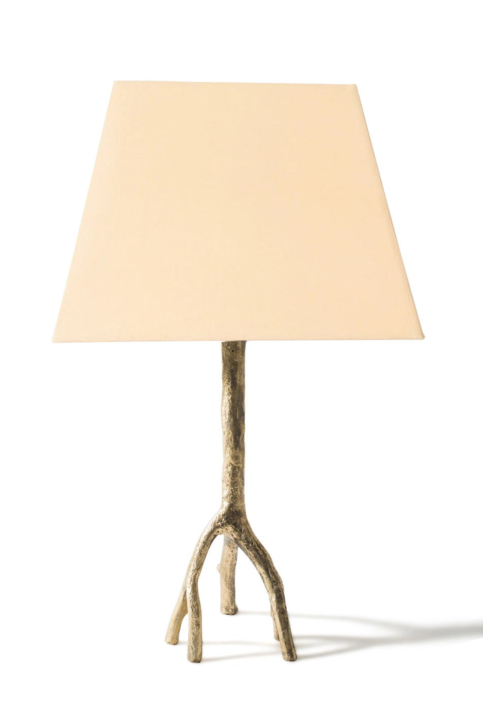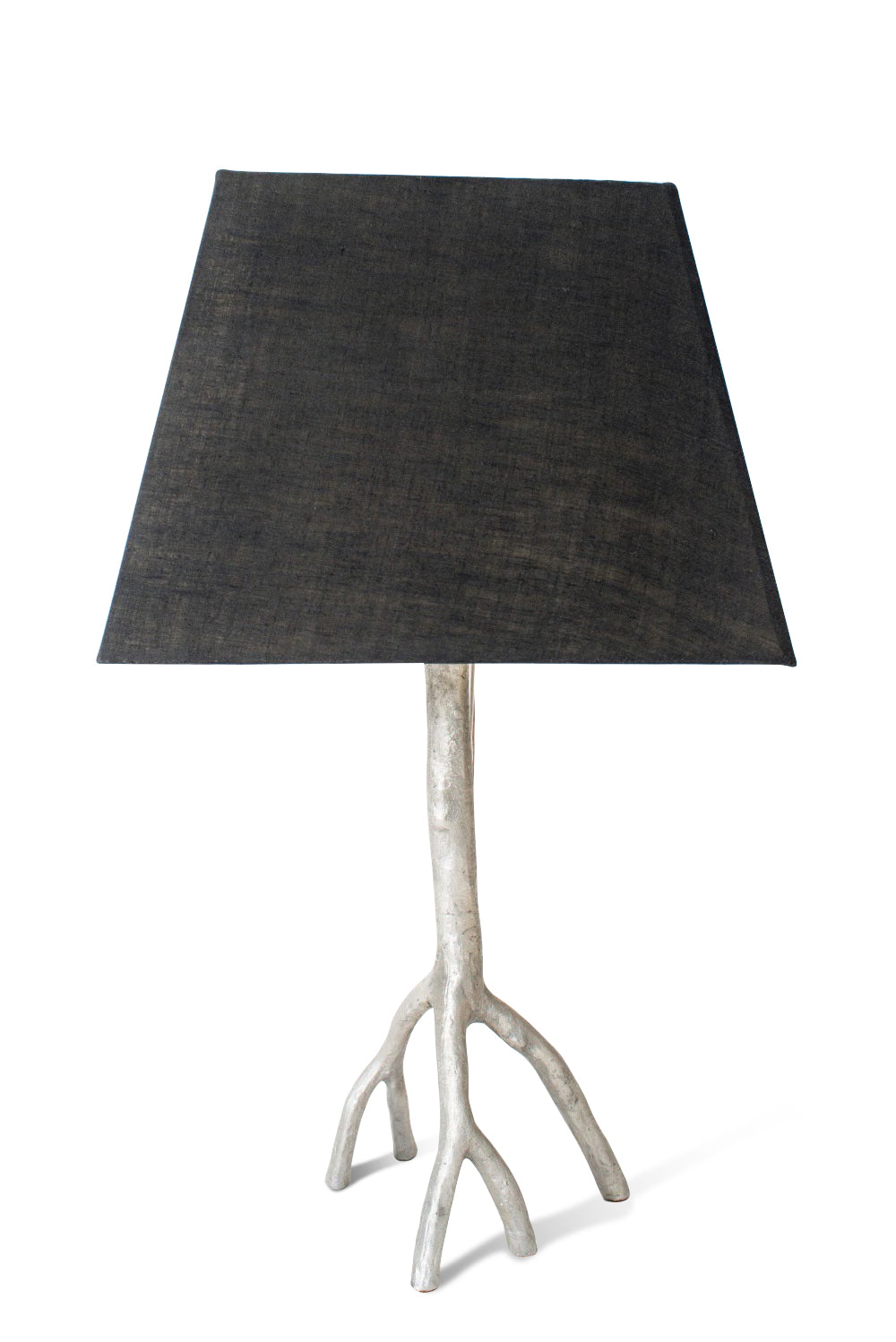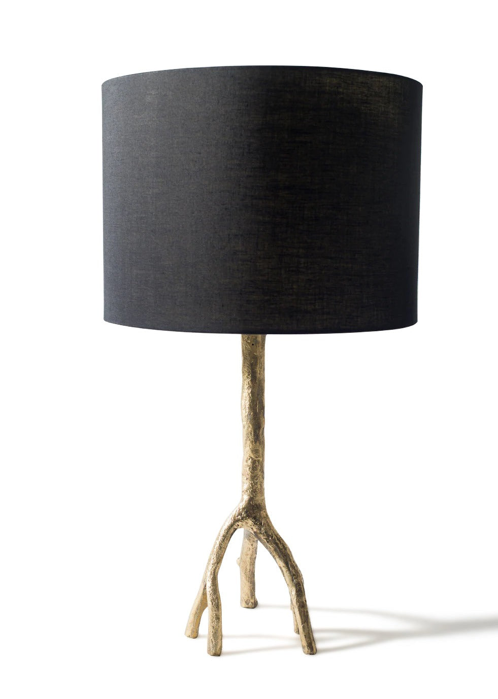 Hand-cast in bronze, aluminum, and black. Over time, it will naturally develop a beautiful patina. Includes a handmade, linen-covered shade.