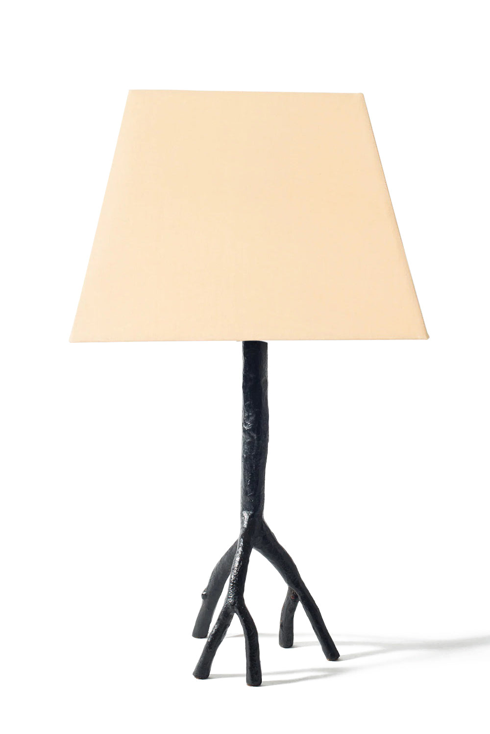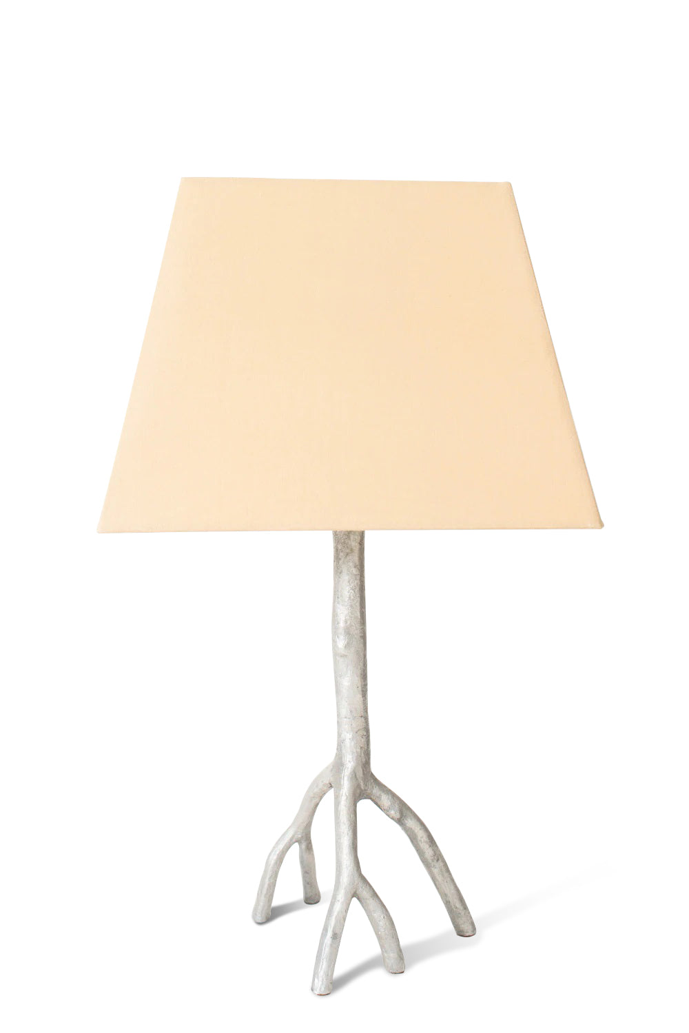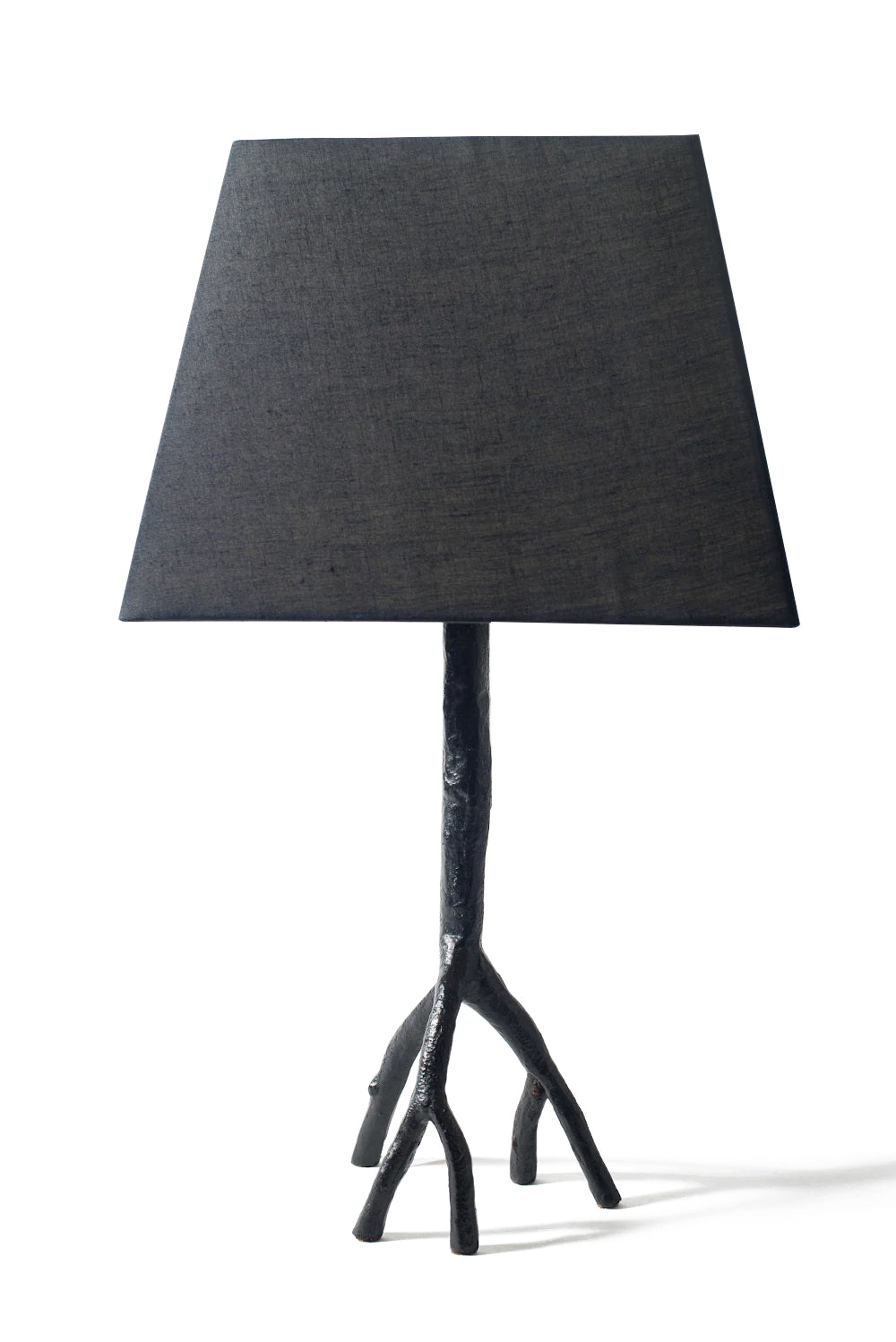 Hand-cast in bronze, aluminum, and black. Over time, it will naturally develop a beautiful patina. Includes a handmade, linen-covered shade.